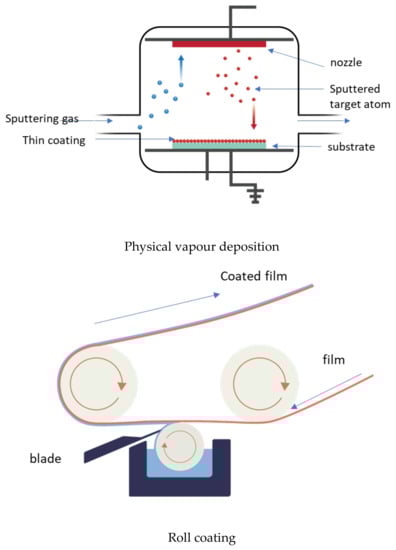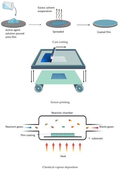 Technically, a coating is the deposition of a continuous layer of a material to a substrate, in our case a polymer-based film. These coatings serve as a functional layer, or a layer for embedding the active agents. There are several established methods, such as spraying, electrospraying, dipping, cast coating, chemical vapour deposition, physical vapour deposition, roll-to-roll, and printing (screen printing) used for coating (Figure 8) []. Spray coating is the process in which the active agents (usually melted) are forced through a nozzle using high pressure (sprayed) and deposited onto the surface to form a coating. Dip coating is a process by which the film is submerged in the coating mixture and taken out and dried. Cast coating is when the active agents are dissolved in a suitable solvent and poured onto the surface of the film and allowing the solvent to evaporate. Chemical vapour deposition (CVD) is the technique in which the active substances that are in the vapour phase are condensed to generate a solid thin layer on the films []. Physical vapour deposition (PVD) involves the deposition of a thin, solid layer on the film by the condensation of a vapourised form of the solid substance, i.e., in CVD coating the material is in gaseous form, and the atoms moving around will react with the film’s surface, while, in PVD, it is in solid form, and does not react chemically with the substrate. Roll coating is a technique which uses a series of rollers to apply the coating liquid on the substrate. Screen printing is a process in which the coating substance is forced through a mesh screen onto a surface of the film []. The resulting films will possess the targeted functionality. The coating method is chosen depending on the physical and chemical nature of the substrate as a coating, and the physical, chemical, and structural form of the adsorbed coating. The coating can be either single-layer or multilayer, using the layer-to-layer technique [,].