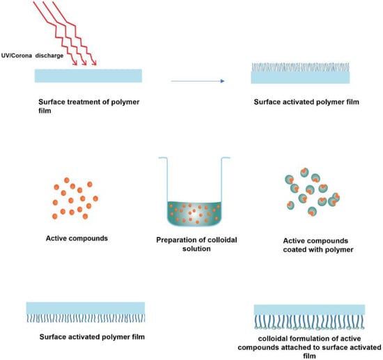 Enzymes, polyphenols, and biopolymers like polysaccharides, proteins, etc.,are the compounds that generally form macromolecular colloids, and have been reported successfully as coatings on packaging surfaces [,,,,,,]. Carotenoids, alkaloids, phenolic acids, flavonoids, monoterpenes, isoflavones, and aldehydes are some of the active compounds found in plants that are being explored for active packaging []. Phenolic compounds are the most important active compounds among them []. The main principle for binding these bioactive compounds to a polymeric surface is adsorption via electrostatic interactions, ligand-receptor pairing, and covalent bonding. A prior functionalisation by treatment with ionised gas, UV irradiation, etc. is essential for polymeric films like PP, which does not have reactive side chain groups and are hydrophobic in nature []. There are many reports on macromolecular colloidal dispersions, especially polysaccharides such as chitosan, cellulose, xanthan, etc., as surface coatings for commercial plastic films [,,].
