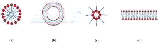 Based on the nature and structure of the dispersed phase particles, they are divided into multimolecular, macromolecular, and associated colloids. The multimolecular colloids consist of atoms or small molecules (with a size of ≥1 nm) aggregated together, such as metal and metal oxide nanoparticles, that form aggregates and are deposited on polymer films. Macromolecular colloids are individual macromolecules like polymers, that are large enough to be considered as colloids. This type of colloid is made up of high molecular weight compounds []. Colloidal particles can also be prepared from macromolecules by simple methods such as ionic gelation, precipitation, and coacervation []. Proteins, polysaccharides, starch, enzymes, etc. are some naturally occurring macromolecular colloids. The third class of colloids are associated colloids. They are formed by particles that behave like strong electrolytes at low concentrations, but like colloids at high concentrations []. They are formed by the association of compounds such as long-chain fatty acids, quaternary ammonium compounds, etc. There are different types of association colloids, such as surfactant micelles, vesicles, bilayers, reverse micelles, etc. (Figure 11).
