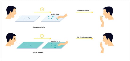 Finally, an additional attempt is made to discuss the challenges and efforts to achieve SARS-CoV-2 inhibitory properties to counter the current pandemic scenario. SARS-CoV-2 viruses can remain active on packaging surfaces for up to several days, and therefore pose a high risk of cross-infection from packaging surfaces in stores. If a packaging surface contaminated with the virus is touched by the next user, the virus will be transmitted to him/her []. Therefore, developing both antimicrobial and antiviral coatings in one stable concept is a major challenge nowadays [,,].