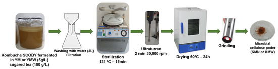 The native culture of kombucha was provided by Teresa Carles Manufacturing S. L. (Barcelona, Spain), and was used as the starter culture and inoculum for a new batch of kombucha fermented in an infusion of yerba mate (5 g/L) and sucrose (100 g/L). KMW was obtained from the fermentation of one kombucha SCOBY from that batch in a 2.5 L sugared infusion prepared either with 15 g of yerba mate (YMN) and/or yerba mate waste (YMW), 300 g of sucrose, and 500 mL of stock culture, which was maintained at static conditions at 22 ± 2 °C and then covered with a textile cloth for 30 days. A new floating disc was produced, and it was recovered, washed with distilled water, filtered off, and further sterilized at 121 °C and 101 kPa for 15 min in a steam autoclave. The disc was then homogenized by ultraturax at 30,000 rpm for two minutes (4 cycles of 30 s) and dried at 60 °C for 24 h. The dry matter, determined by drying at 105 °C until a constant weight was reached, showed a yield of ca. 1.3 ± 0.1%, in accordance with previous reported works [16]. Then, the obtained cellulosic paper was ground to obtain a powder and further sieved (500 μm). In Figure 1 the wall process to obtain either KMN or KMW from the SCOBY fermented in YM or YMW and convert it to the powder able to be processed by melt extrusion is schematically represented.