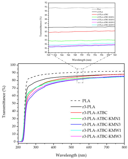 The transmittance of the obtained films was measured by means of a UV-Visible spectrophotometer, and the absorption spectra of the films are shown in Figure 2. Neat PLA film was also analyzed for comparison. From the spectra, it could be seen that although all formulations based on recycled PLA (r3-PLA) resulted in less transparent materials than PLA, they were mostly transparent in the visible region of the spectra (400–700 nm) allowing the films to be seen through, which is one of the most important requirements for food packaging due to consumers’ acceptance [30]. It is also very important that films intended for agricultural applications should not only protect crops, but also permit the photosynthesis process to occur [1,31]. Among reprocessed films, r3-PLA film was the most transparent film, showing the highest transmission along the visible region of the spectra (400–700 nm). The incorporation of ATBC slightly affected the transparency of r3-PLA, as was already observed with the addition of ATBC to a virgin PLA matrix [22]. The transparency was slightly reduced with the incorporation of KMN and/or KMW. Absorption measurements were conducted in the range of 540–560 nm (see zoom image in Figure 2) of the visible region of the spectra, and it can be seen that the materials resulted as highly transparent (between 81% and 87% of transmittance).