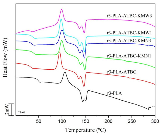 DCS analysis was conducted and used to investigate the glass transition (Tg), cold crystallization (Tcc), melting temperatures (Tm), and crystallinity (χc) of plasticized 3r-PLA-ATBC films, and the obtained DSC curves are shown in Figure 4 while the obtained results are summarized in Table 2. The r3-PLA film showed the Tg at a lower value than the PLA samples which were processed three times by melt extrusion and further processed by injection molding (Tg = 64 °C [13]), due to the presence of a residual solvent, as was demonstrated by Yang et al. Their study compared PLA-based composites processed by extrusion with those processed by solvent casting method, and concluded that limited variations in the DSC parameters were observed for samples processed with the two different processing techniques (melt extrusion and solvent casting method) [33]. In the r3-PLA film, a cold crystallization peak appeared which was not present in the virgin PLA pellet [13], and this has been related to the fact that the shorter PLA chains formed during the reprocessing cycles, such as oligomers, showed higher mobility levels and promoted the crystallization of PLA [13,29]. In fact, it has been observed that PLA plasticized with oligomeric lactic acid (OLA) showed a reduction in cold crystallization temperature, which was further reduced by increasing the OLA content [34,35]. Similarly, the incorporation of the ATBC plasticizer produced a decrease in the Tg and Tcc, as well as in the Tm, which is ascribed to the ability of the ATBC plasticizer to increase the free volume between the polymer chains. Accordingly, their mobility was also decreased, enhancing the slow crystallization rate [22,36]. On the other side, the combination of the ATBC plasticizer and the microbial cellulose particles onto a plasticized 3r-PLA matrix produced higher Tg and Tcc values and higher crystallinity degrees, suggesting that the segmental motion of PLA matrix may have been affected by the presence of KMN and KMW [33]. Moreover, the synergic effect on the crystallization of PLA as a consequence of a potential nucleating agent in a presence of citrate ester plasticizers has been already reported [25,37]. The DSC thermograms show a double melting behavior, which has already been observed in mechanically recycled PLA [38,39] and PLA plasticized with OLA [34]. This behavior, in PLA-based materials, is ascribed to the presence of different crystalline structures with different levels of perfection and thermodynamic stability. The melt PLA crystallizes at temperatures higher than 120 °C in an ordered form (α form) [40]. In the present work, all samples were crystallized at temperatures below 120 °C. This is related to the ability of shorter polymer chains (oligomers), produced as a consequence of the PLA degradation during reprocessing steps, to promote the aforementioned crystallization of PLA. The reduction in the cold crystallization temperature was particularly marked in plasticized 3r-PLA-ATBC samples. When PLA crystallized below 110 °C, less stable crystals appeared, known as α′ crystals [40]. From the cold crystallization peak in the DSC thermogram, it can be observed that disorder (crystals with α′ form) to order (crystals with α form) phase transition took place, suggesting that a great fraction of the polymer was in an amorphous state due to the DSC cooling scan applied, as this was already observed in plasticized PLA-ATBC samples [15,41]. An increase in the Tcc values of KMN- and KMW-loaded films was observed with respect to the r3-PLA-ATBC film, suggesting that somewhat fewer disordered crystals (α′) are present in composite materials. A different crystallization degree was observed for PLA-ATBC-KMN-based films with respect to PLA-ATBC-KMW-based films. A higher crystallinity degree was found for those particles obtained from the fermentation of kombucha in yerba mate waste (KMW), and could be directly related to the superior dispersion of KMW particles into the plasticized PLA-ATBC matrix, which are able to promote a higher nucleation effect [25].