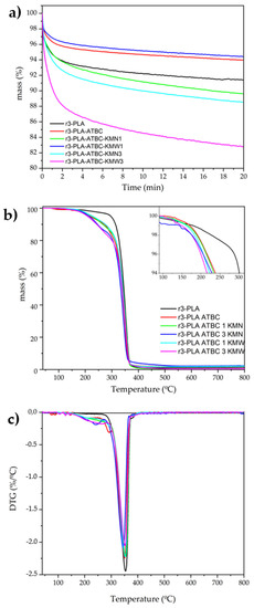 The thermal stability of the materials was studied under isothermal mode at 180 °C to ensure enough thermal stability for the typical melt-processing temperature of PLA (Figure 5a). During the first minute under TGA isothermal conditions, films experienced a quick weight loss, probably due to the evaporation of the remaining chloroform. Then, all the materials showed a mass loss of around 1 or 2% in 10 min, which allows enough time to process the PLA-based materials. 3r-PLA-ATBC-KMW1 showed very similar thermal stability to 3r-PLA-ATBC, whereas 3r-PLA-ATBC-KMW3 presented less thermal stability. This could be related to the fact that when higher amounts than 3 wt.% of KMW reinforce 3r-PLA, some part of the PLA matrix is non-stabilized due to the deficient particle dispersion. Nevertheless, it should be highlighted that all the materials showed enough thermal stability for melt extrusion purposes.