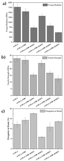 Tensile test measurements of 3r-PLA-ATBC-based films: (a) Young modulus, (b) Tensile Strength and (c) Elongation at break.