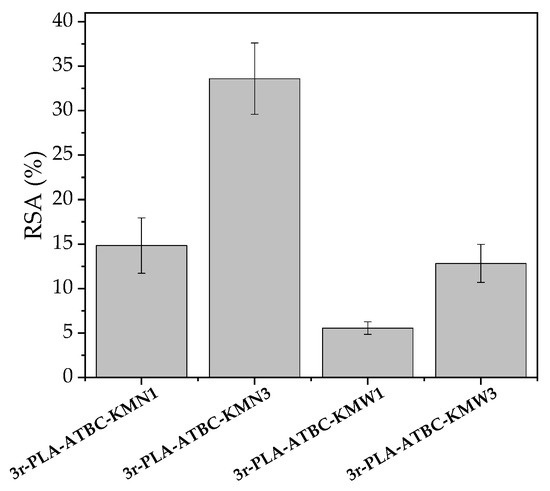 As expected, the r3-PLA film did not show any antioxidant activity. The KMN and KMW were processed into thin films and also subjected to the food simulant for comparison. The neat KMN film showed high RSA activity of 70.2 ± 1.1% and 55.2 ± 11.7%. Meanwhile, the films loaded with KMN or KMW showed some antioxidant activity, as microbial cellulose obtained from kombucha fermentation possesses natural and remarkable antioxidant activity, which is directly related to the infusion used for the fermentation [18]. Films loaded with KMN showed higher antioxidant activity than those loaded with KMW, as it is known that yerba mate waste possesses a low polyphenol content due to the hydrothermal extraction process used during infusion preparation (temperature higher than 80 °C) before obtaining the waste. The scavenging effect obtained here for 3r-PLA-ATBC-based materials loaded with microbial cellulose kombucha fermented in yerba mate or yerba mate waste (between 1 wt.% and 3 wt.%) are low, but it should be highlighted that they still possess some antioxidant activity and, thus, the results interesting for food crops and food packaging. A high level of antioxidant activity has been observed in materials containing yerba mate extract. For instance, Deladino et al. studied corn starch-loaded materials with yerba mate extract at a concentration of around 10 wt.% with respect to the starchy matrix, and found between 40% and 60% RSA [19]. The values obtained in the present work are in the range of other antioxidant materials based on tri-layer recycled PLA/sodium caseinate (SC)/recycled PLA-based materials reinforced with 1 and 3 wt.% of nanoparticles obtained from yerba mate waste (YMN) (RSA (%) of rPLA/SC/rPLA-YMN1 = 6.4 ± 0.1 and RSA (%) of rPLA/SC/rPLA-YMN3 = 11.0 ± 0.2) [39].