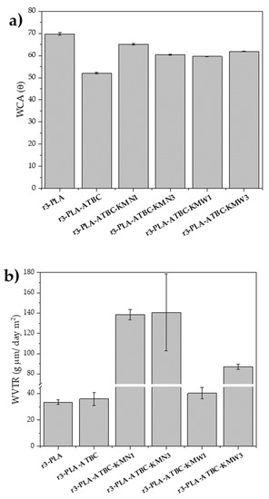 (a) Static water contact angle measurements and (b) water vapor transmission rate of 3r-PLA-ATBC-based films.