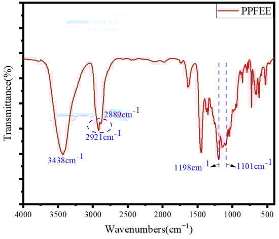 The PPFEE-based polyurethane elastomers were prepared via a prepolymer process (Scheme 1). The FTIR spectrum provided the first confirmation of the PPFEE structure. As shown in Figure 1, the strongest peak at 3438 cm−1 corresponded to O-H stretching vibration, and the bands around 2921 and 2889 cm−1 were related to -CH2- stretching vibrations. The stronger peak at 1198 cm−1 was ascribed to C-O-C, and the bands attributed to C-F stretching vibrations were observed at 1101 cm−1.
