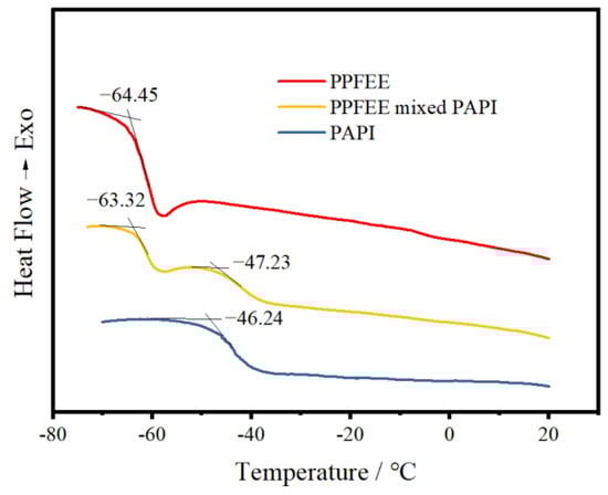The Tg is one of the most important parameters of polymeric binders because it has a decisive influence on mechanical properties at low temperatures [22]. Figure 3 shows the second-heating DSC curves of the PAPI, PPFEE, and PPFEE/PAPI mixture. The PPFEE exhibited a low Tg of −64.45 °C, which was beneficial for low-temperature properties. The PPFEE/PAPI mixture showed two Tg indicating their incompatibility.