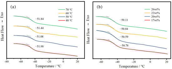 Glass transitions are associated with the movement of polymer chain segments due to intermolecular interactions. The interaction between hard and soft segments can be indicated through the analysis of changes in the Tg of samples prepared under different conditions. Figure 4a shows that Tg increased first and then decreased with the increase in the curing temperature. The Tg at the curing temperature of 50 °C was the maximum owing to the central arrangement of hard segments, which was consistent with the results for the tensile strength. As shown in Figure 4b, the Tg of PPFEE-based polyurethane elastomers increased slightly with the increased contents of hard segments due to the increase in the percentage of hard segments dissolved in the soft segment domains.