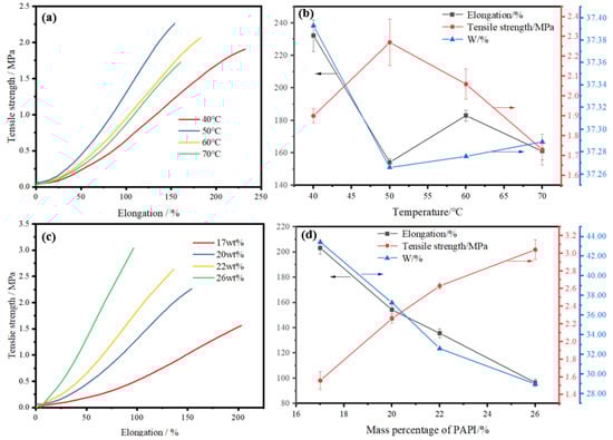 Mechanical properties of PPFEE-based polyurethane elastomers cured with 20 wt% PAPI at different temperatures (a,b) and with different amounts of PAPI content at 50 °C (c,d) (five splines for each curing condition were used as parallel tests, and the most reproducible data as the final result).