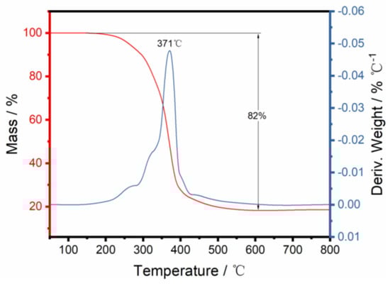 The thermal stability of polymeric binders is a critical property for their application in solid propellants [30,31,32]. Thus, TG and DTG were used to study the thermal decomposition behavior of polyurethane elastomers (Figure 6). The TG curve showed one distinct region of weight loss in the thermal decomposition of the PPFEE-based polyurethane elastomer. The stage presented a slow weight loss starting at nearly 200 °C, and this result corresponded to the decomposition of the end groups and a small number of side chains. Then, the main chain decomposed, and the weight loss rate gradually increased. The weight loss temperature was observed at 371 °C with a sharp weight loss. After the complete thermal decomposition, the remaining residue was approximately 18%. In any case, the TG/DTG results confirmed that PPFEE-based polyurethane elastomers had satisfactory thermal stability.