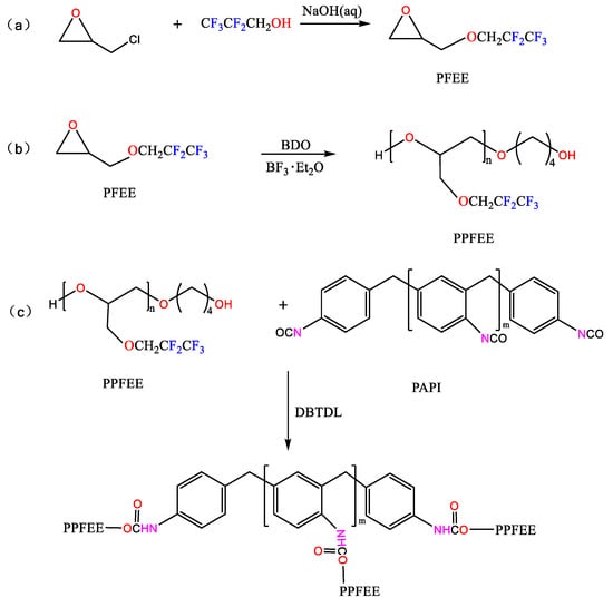 PAPI, whose isocyanate content was 30.87 g/100 g, was purchased from Zhengzhou Keyunlong Chemical Products Co., Ltd. (Zhengzhou, China) and used without further purification. 2,2,3,3,3-Pentafluoropropanol and epichlorohydrin (ECH) were purchased from Aladdin (Shanghai, China). BF3·OEt2, phthalic anhydride, DBTDL, sodium hydroxide (NaOH), sodium sulfate (Na2SO4), and methylene chloride (CH2Cl2) were purchased from Chengdu, Kelong Chemical Reagent Factory (Chengdu, China). BDO was purchased from Tokyo Chemical Industry Co., Ltd. (Shanghai, China). All the reactants were used without further purification.