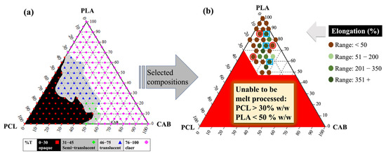 The preliminary predictions of miscibility between polymers pairs (PLA/PCL, PLA/CAB and PCL/CAB) were studied using the Coleman and Painter approach, following previous work [19,30]. Table 1 shows that PLA/PCL is predicted to be an immiscible blend that shows critical solubility parameter differences (∆δ) of 1.8 (cal cm−3)1/2, while PLA/CAB is predicted to be a miscible blend (∆δ = 0.1 (cal cm−3)1/2). PCL/CAB blends may be miscible or immiscible depending on the molecular interactions (∆δ = 1.7 (cal cm−3)1/2). The binary and ternary solvent-mediated blends based on PLA were constructed in the form of an optical ternary phase diagram (Figure 1a). Compositions from different regions (opaque, translucent and clear) were selected for melt-blending.