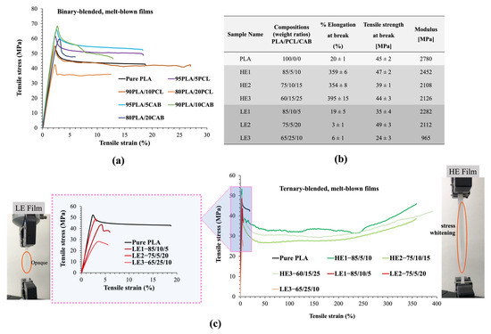 Tensile stress and tensile strain of binary-blended, melt-blown films (a), compositions and tensile property of ternary-blended, melt-blown films of LE and HE samples (b), tensile stress and tensile strain of ternary-blended, melt-blown films, inset figure shows the low tensile strain of LE film samples and appearances of LE and HE films from the tensile test (load cell of 1 kN and extension rate of 20 mm/min) before break (c). Note: Six samples were tested for each blended film.