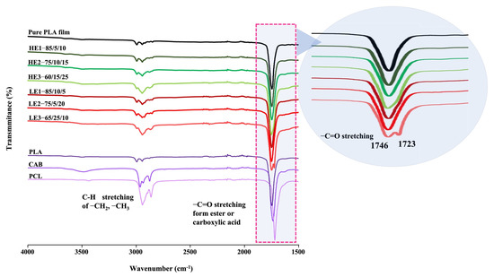 Miscibility is a vitally important property that can improve mechanical performance of polymer blends [31]. The blends are miscible or immiscible depending upon the competition between recrystallization and intermixing of polymers [17,19,30]. Miscibility promotes good interfacial adhesion of polymer molecules that may lead to improved polymer blends. FTIR spectroscopy was used to observe the molecular interactions in PLA/PCL/CAB blends (Figure 4). Pure PLA, PCL and CAB show FTIR absorption bands of –C–H stretching of –CH2 and –CH3 at 2700–2900 cm−1 and bands of –C=O stretching from ester or carboxylic acid groups at 1730–1750 cm−1. For the HE films, a shift to lower frequencies and broader peaks of –C=O stretching (ester or carboxylic acid groups) is observed (inset picture) when compared with pure PLA (sharper peak resulting from self-aggregation). This is possibly due to the diminished intermolecular packing (freedom movement) of polymer chains as well as possible molecular interactions from hydrogen bonding between CAB with either PLA or PCL, which cause a change in the electron cloud that alters the resonant frequency of that particular bond. This gives rise to different molecules having slightly different hydrogen bonding states leading to different frequencies and a broad band. For LE films (especially LE3), peaks of the –C=O stretching are simply the combination of the spectra of the two or three homopolymers, as expected for immiscible blends [33].