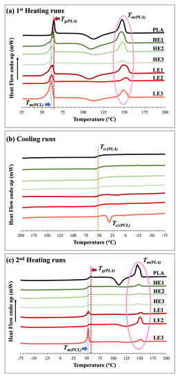 Miscibility observed by DSC was also studied and shown in Figure 5. The glass-transition temperature (Tg) and melting temperature (Tm) of melt-blown PLA films (from first heat runs, Figure 5a) are observed at approximately 64 °C and 148 °C, respectively. To subtract the effect of thermal history, the second heating runs (Figure 5c), including the cooling run (Figure 5b), were measured. The HE films display lower Tg and Tm than pure PLA films in both the first and second heating runs. There are no crystalline peaks in the cooling runs, only LE3 films show cold crystallization (at Tcc) of PCL. For the second heating run, however, all HE films show the Tg peak of PLA, no Tm peaks of PCL, and very small crystalline peaks of Tm of PLA. Whereas, all LE films show both Tm crystalline peaks of PCL and PLA due to re-crystallization of their chains, which causes phase separation (as seen in Figure 3e,f,g) and immiscible blends. The reason for the peak shifting towards a lower temperature and the change in the DSC thermogram of ternary-blended, melt-blown films when PCL and CAB were added into the blends is attributed to the enhancement of chain mobility by the low molecular weight of PCL (no crystalline peak observed) as well as amorphous structures from CAB, resulting in HE films being miscible blends. These findings are similar to those seen in the work by El-Hadi et al., who reported that the addition of tributyl citrate (as plasticizer) and poly(3-hydroxy butyrate) to the PLA matrix leads to a reduction in Tg, Tcc and Tm when compared to pure PLA [27].