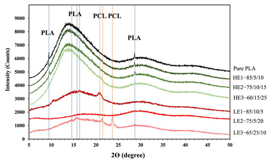 The XRD patterns of PLA and the ternary-blended, melt-blown films of PLA/PCL/CAB at different compositions are presented in Figure 6. The PLA film exhibited two broad peaks at 2𝜃 values of 14.5° and 30° and very small sharp peaks at 9.7° and 28.5°. All HE films showed similar spectra to pure PLA films but with lower peak intensities as lower amounts of PLA were present in the blends. No crystalline peaks associated with PCL were observed (Figure 5c). The LE films also showed broad peaks (PLA), albeit with lower intensities than HE films, alongside the crystalline peaks of PCL at 2𝜃 values at 20.8°, 21.5° and 23.7°, especially in LE3, which has the highest content of PCL. In addition, the degree of crystallinity of the samples according to DSC and XRD data was observed and showed similar values to the crystallinity of pure PLA film, which is approximately 25%.