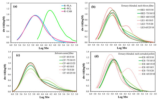 GPC traces of: (a) PLA, PCL and CAB pellets from raw materials, (b) ternary-blended, meth-blown films of PLA/PCL/CAB (HE and LE films), (c) solvent-casted films of PLA/PCL/CAB and (d) ternary-blended, melt-extruded pellets.