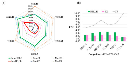 Molecular weights (Mw and Mn) of ternary-blended, melt-blown films (HE, LE), ternary-blended, melt-extruded pellets (EX) and solvent-casted films (CF) of PLA/PCL/CAB at different compositions (a), and their polydispersity (PDI) (b).