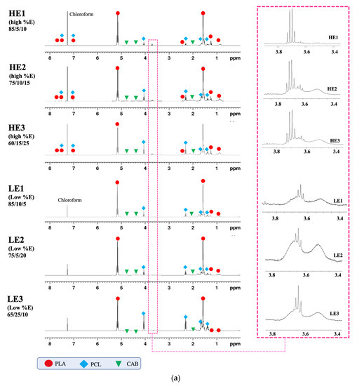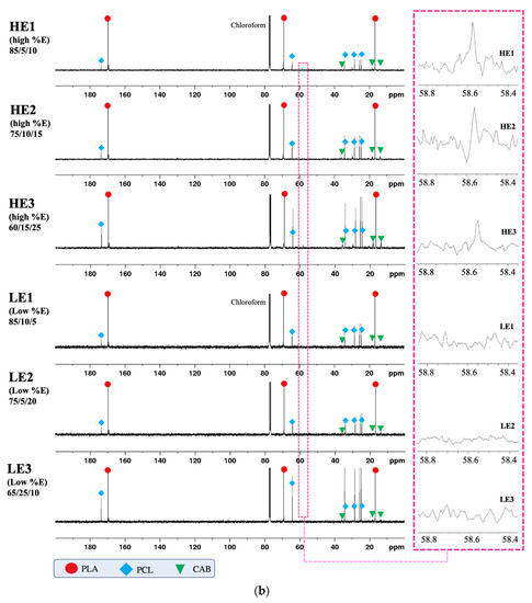 The NMR spectra from the LE and HE films are shown in Figure 9a (1H NMR). All the peaks were identified with the relevant symbols of PLA, PCL and CAB, which were analyzed using the chemical shifts at the positions of hydrogen in each pure polymer (as seen in Figure 10). All ternary blend samples show identical peaks, except for the new quartet peaks at the chemical shifts between of 3.68–3.73 ppm, which is only seen in HE1, HE2 and HE3 (high %elongation films) (see zoomed in section). In Figure 9b (13C NMR), similar results from 1H NMR are seen with all peaks again being identified with the symbols of the chemical shifts from carbon atom positions of pure PLA, PCL and CAB. All films show identical peaks except for the peak at the chemical shift of 58.54 ppm, which is only seen in melted-blend films of HE1, HE2 and HE3 (see zoomed in section). The new peaks in the HE films from 1H NMR at 3.68–3.73 ppm and from 13C NMR at 58.54 ppm are thought to be from a methylene unit (–O–CH2–CH3) produced during the melt-blending process from mostly chain scission, but also including possible transesterification. In addition, to confirm this assumption, the solvent casted-films of PLA/PCL/CAB at the same compositions of HE1, HE2 and HE3 were also analyzed by NMR. The results show no extra peaks of 1H NMR such as the quartet peak at 3.68–3.73 ppm and 13C NMR peak at 58.54 ppm (see Figure S1). This is due to the solvent mixing process in the formation of solvent-mediated blends, which allows for only the intermingling between polymer chains and not for chain scission and the potential formation of new linkages between created molecules.