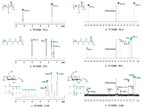 1H NMR (a–c) and 13C NMR (d–f) of PLA, PCL and CAB.