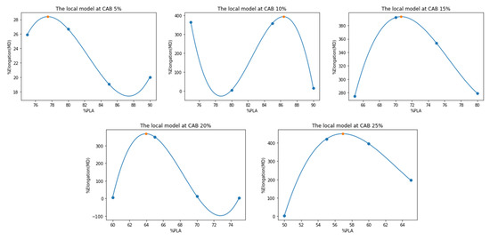 Each local model was considered for finding the maximization with respect to its related %PLA constraint. Table 3 shows the results of the local model maximizing, which predicts the highest value of %elongation and related %PLA ratio, respectively. All local models are shown as graphs in Figure 11.