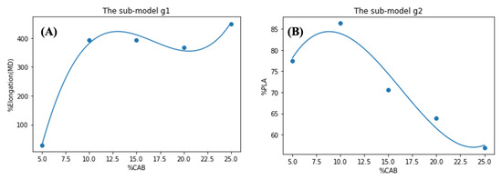 The mathematical models were used to predict the optimal ratio of PLA, PCL, and CAB and the cost-effectiveness. The optimal ratio for the compound means to get the best composition to achieve the greatest %elongation without concerning the cost of raw materials. The model mainly focused on the ideal %CAB ratio and the relationship to the required %PLA ratio. Notice that %PCL is absent because it can be calculated easily later when %CAB and %PLA are already known. The detailed methodologies are described in Section 3.8.