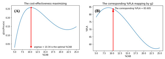 Models showing; the cost-effectiveness maximizing (A) and the corresponding %PLA mapping by g2 (B).