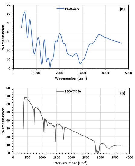 By using IR spectroscopy, the copolymer’s structure was verified. Figure 1 shows the IR spectra of PBOCOSA and PBOCODSA. Such a spectra displayed absorption bands at 607.6, 906, 1246, 1425.4, and 1685.8 cm–1. These absorption bands can be attributed to (CH2)n, a broad band related to the hydrogen bond O-H out-of-plane bending vibration, C-O, CH2, and C=O vibrational modes, respectively. Additionally, it showed bands of absorption at 2947.3 cm–1 that might have been caused by the stretching vibration of the C-H bonds in the paraffinic methylene groups. By examining this figure, it was discovered that similar absorption bands are shown in Figure 1a, where the corresponding absorption bands due to the (CH2)n, C-O, CH2, and C=O vibrational modes were intensely present at 750.3, 1267.3, 1467, and 1709 cm–1, respectively. The production of PBOCODSA may be indicated by an increase in the adsorption intensity for such bands in PBOCOSA. The CH symmetric and CH asymmetric stretch, however, caused absorption bands to form at 2862.8 and 2920.3 cm–1, respectively [26,27,28].
