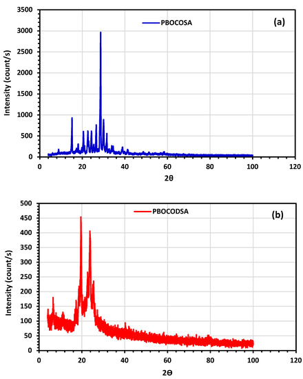 Patterns of XRD for polymeric additives PBOCOSA and PBOCODSA are shown in Figure 3. At 28.54°, 22.52°, 20.16°, 17.86°, and 15.06°, narrow diffraction peaks occurred, which correspond to scattering from the crystalline phase (larger crystallites) of the copolymer matrix, as shown in an XRD of PBOCOSA. Diffraction peaks of crystallites emerged at 11.93°, 13.96°, and 16.04°, with reduced relative scattering strengths, indicating considerable fluctuation in Bragg angle values in the diffractogram of PBOCODSA. PBOCOSA copolymers undergo partial structural transformation upon esterification, which may account for the observed outcome PBOCOSA. These findings show that the inclusion of such polymeric additives’ non-polar alkylated branches would hinder the stacking of the copolymer chains, resulting in lattice deformation, structural disorder, and, ultimately, a less crystalline structure than that of PBOCODSA.