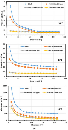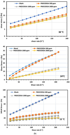 (a) Relation between shear rate and apparent viscosity for crude oil treated with PBOCODSA (500, 1000, and 2000ppm) at 15, 24, and 30 °C. (b) Relation between shear rate and shear stress for crude oil treated with PBOCODSA (500, 1000, and 2000 ppm) at 15, 24, and 30 °C.