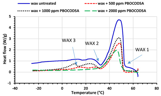 This experimental technique was used to detect changes in crude oil behaviour at low temperatures due to the presence of an inhibitor. The additives tested with PBOCODSA were added in different concentrations (500, 1000, and 2000 ppm) to the studied crude oils. The exotherms (Figure 6) can be due to either solid–solid (orthorhombic to hexagonal) transition or solid–liquid melting transition. WAT reduces with an increasing equilibration time. The presence of three WATs is due to the presence of more than one type of paraffin differing in thermal properties. The enthalpy change of wax crystallization in the crude oil was measured through the DSC cooling curves of untreated and treated paraffin. The crystallization enthalpy was used for the determination of the effect of precipitated wax versus temperature. The value for virgin paraffin was 86.97 J/g and that of the treated paraffin with PBOCODSA was 64.18 J/g, with 500 ppm. This observation means that the PPD has a great effect on the total amount of wax that would completely precipitate. The DSC cooling curves of untreated and treated paraffin with the PBOCODSA polymers’ additive at concentration of 1000 ppm have broadened and shifted to lower temperatures. According to these findings, crystallization slowed down and took place at lower temperatures. The temperature at which the heat flow changed during cooling represents the onset temperature (Tonset) of crystallization. Tonset in relation to additives for the waxy oils at a cooling rate of 10 °C /min is summarized in Table 4. Moreover, Tonset further decreased when PBOCODSA was used; it decreased with the addition of 2000 ppm, demonstrating the effect of the content of mixture from polymers elevated from the presence of stearyl amine. The area of the peak displays a declining tendency, which means that crystallizing processes have occurred when the mixture was continually cooling.