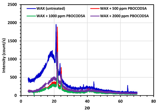 XRD of untreated paraffin wax from crude oil and its corresponding treatment with PBOCODSA.