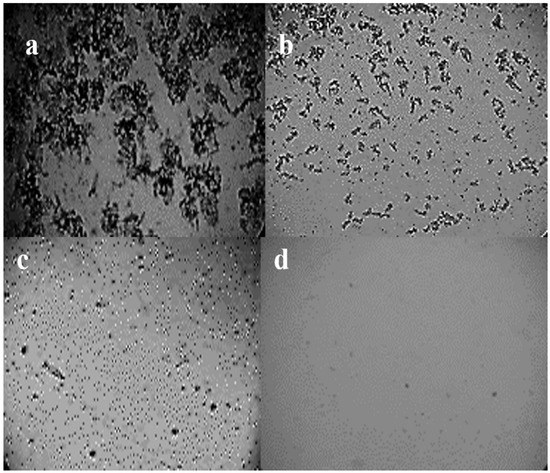 In the absence of additive for virgin crude oil, there was a dense amount of small, dark particles of wax crystals where aggregates had haphazard arrangements (Figure 8a). When the crude oil was treated with 500 ppm PBOCODSA, it is notable that the crystals were dramatically changed to tiny particles that were treated with PBOCODSA, with the wax-crystals aggregating into large flocs. Further additive, with a concentration of 1000 ppm, resulted in a decrease in crystals and a clear sample from crystals when treated with PBOCODSA, where the structure of the wax-crystal flocs is loose (Figure 8d). A reduction of the crystals’ size was found by the further addition of improvers PBOCODSA with a concentration of 2000 ppm. In comparison with Al-Sabagh [20], who investigated the copolymer aliphatic side chain styrene maleic anhydride co-amide which exhibited the maximum pour point depression (ΔPP = 21 °C at 1500 ppm), our PBOCODSA has the same depression result but at 2000 ppm. From the results, with the interaction mechanism under low temperature and without PBOCODSA addition, the high content of the wax crystals with short distances facilitates hydrophobic bonds that form wax aggregates, as shown in Figure 8a. These convert the waxy crude oil to a two-phase system: the lower phase is wax and the upper phase is oil. Moreover, wax aggregates can be grown due to the interaction of the wax intermolecules, forming networks and hampering the crude oil flowability. These results are consistent with the high pour point of waxy crude oil at 24 °C. By using PBOCODSA with polar and non-polar groups, the interaction mechanism refers to adsorption or co-crystallization or both [30,32,33]. The co-crystallization occurs between non-polar alkyl groups of PBOCODSA molecules and wax molecules. Meanwhile PBOCODSA is composed of polar amine groups in addition to the non-polar groups. These polar groups exist on the surface of the wax crystals and absorb low molecular weight polar substances to the wax-crystal surfaces and form a layer of energy barrier, called a solvated layer [34]. These solvated layers not only change the interface properties between the wax crystals and the oil phase, but they also prevent the connection of the wax crystals and the formation of larger crystal aggregates [35,36].