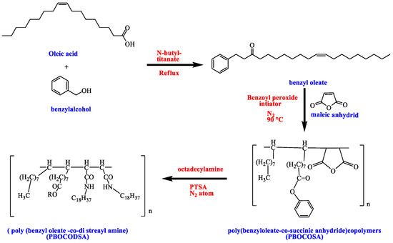 Using benzoyl peroxide as the initiator (1% w/w), the pre-prepared benzyl oleate was copolymerized with maleic anhydride in toluene at molar ratios of 1:2 and 1:1, respectively. Then, 20 h of continuous stirring at 90 °C was used to complete the polymerization. Petroleum ether 40/60 was used to precipitate the copolymer, and the same mixture was also used to filter and wash the copolymer. At 60 °C, the product was dried [5].