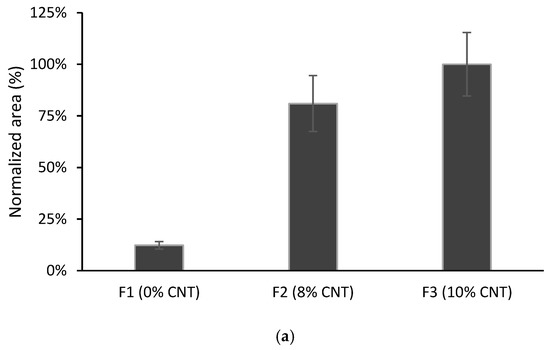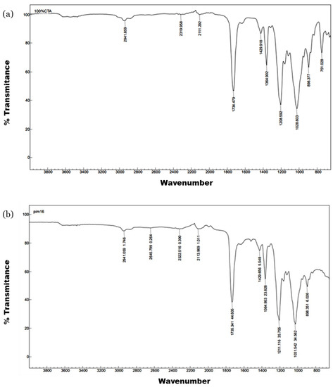 As for the FT-IR spectra, the films with MWCNTs presented the characteristic bands of the polymer, as can be seen in Figure 2, particularly at 1734 and 1037 cm−1, corresponding to the C=O and C-O-C stretching vibrations in the CTA polymer. The wavenumber of the transmission band did not shift due to the presence of the carbon nanomaterials (Figure 2b).