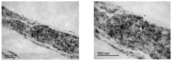 The TEM images (Figure 4) confirm the “layer like” distribution of MWCNTs within the bulk polymer, as was seen by SEM. Detail of the MWCNTs can also be observed in Figure 4b.