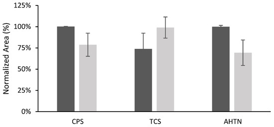 TFME response of F1 for different water matrices (n = 3). The samples were spiked at 200 µg L−1 for CPS and AHTN, and at 2000 µg L−1 for TCS.