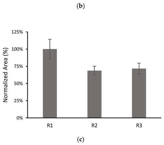 Comparison of the results for three different films with 10% MWCNTs: (a) CPS; (b) TCS; (c) AHTN. Volume of solution 10 mL spiked at 203 µg L−1 for CPS and AHTN and 2000 µg L−1 for TCS. The number of replicates for each film was 3, except for TCS R3 (n = 1).