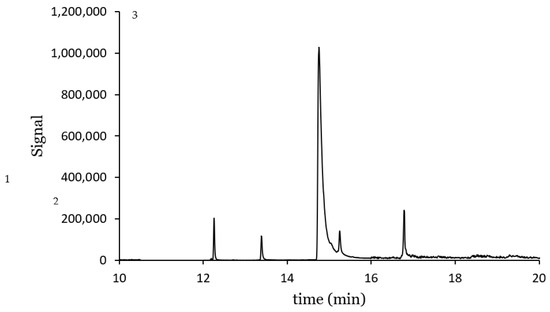 A chromatogram at the lowest concentration from the working range studied is shown in Figure 8. The compounds were well identified, with negligible noise. It is worth mentioning the pronounced tail of the chromatographic peak for TCS, which makes the integration more difficult with greater variability of the results. This is also evident from the lowest determination coefficient in Table 4.