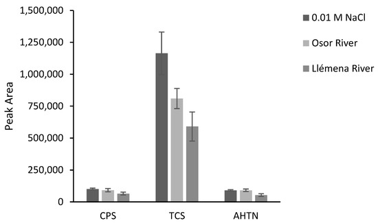The developed method was applied in the extraction of analytes from two rivers in Catalonia, northern Spain: the Osor River (a mountain river, the sampling point was in a forest area) and the Llémena River (the sampling point was close to an urban center but in an area of farms where animals are fattened). Aliquots of the sample were first tested to ensure the absence of the target analytes. Further aliquots were then spiked at 200 µg L−1 for CPS and AHTN, and at 2000 µg L−1 for TCS. In Figure 9, absolute areas were presented together with the peak areas obtained from the 0.01 M NaCl solution spiked at the same concentration level. This plot allows a qualitative evaluation of the matrix effect. As can be seen, for CPS and AHTN, the only significant differences were found in the case of Llémena water. TCS is the compound that presents the most differences due to a stronger matrix effect.