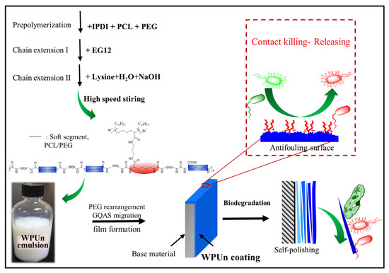 Waterborne polyurethane has been widely used in biomedical areas, wood coatings, leather coatings, architectural coatings, corrosion protective coatings, and other fields [4,5]. Polyurethane is a multi-block polymer with good molecule tailing capability, which can quantitatively introduce various functional groups into the molecular chain through simple molecular structure design [6,7]. For example, introducing quaternary ammonium salt into the molecular chain of polyurethane can give killing property of polyurethane, and silicon and fluorine chain can reduce the coating surface energy and releasing contaminants [8,9,10]. However, coatings with only biocidal components requires a large dosage to achieve anti-fouling effect, and the dead microorganisms will adhere to the coatings’ surface, which can hinder the further biocidal activity and lead to the formation of biofilm [11,12]. Coatings with amphiphilic components, such as zwitterionic compounds and polysaccharides [13], poly(ethylene glycol) (PEG) [14], and gels [15] have showed extremely good fouling-resistant properties, which are widely used for fouling-resistant coatings. Silicone- or fluorine-based polymers [16] with hydrophobicity, low surface energy, and low elastic modulus have the best foul-release performance, which is considered as foul-release coatings. However, the low surface energy and low elastic modulus accompanied by the hydrophobicity could lead to less interaction of the coated surface with other materials and reduce the adhesive force of the coating [17]. What is more, fouling-resistant or foul-release coatings cannot completely preclude the adhesion of microorganisms, and once adhesion occurs, microorganisms will multiply and eventually lead to the loss of anti-fouling function [18,19]. Therefore, coatings having the ability to resist fouling adhesion and kill fouling organisms are potential anti-fouling measures [20,21,22].
