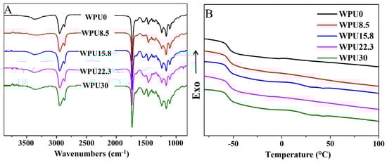 Figure 2. (A) The transmission FTIR spectra of WPUn samples. (B) DSC thermograms of WPUn samples (second heating).