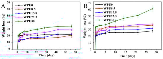 Figure 3. Weight loss profile of WPUn films under hydrolytic and enzymatic degradation. (A) Hydrolytic degradation in PBS; (B) Enzymatic degradation in PBS + lipase PS.
