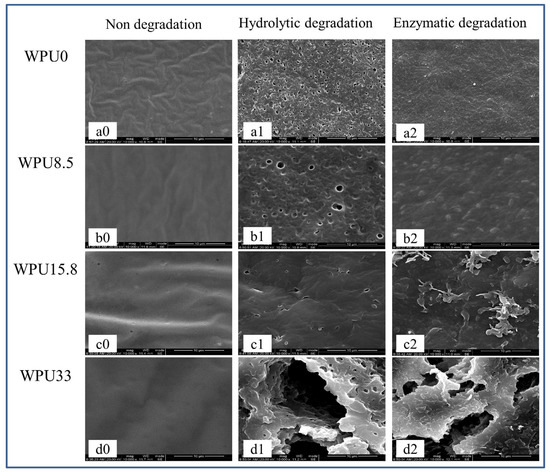 SEM was used to observe the surface morphology changes of these WPUn samples after degradation to study their degradation mechanism. Figure 4 shows the SEM images of WPU film surfaces without degradation, hydrolytic degradation in PBS, and enzymatic degradation in PBS + lipase PS media. After 28 days of degradation in PBS, surface of WPUn shows lots of holes and even cracks (Figure 4(a1,b1,c1,d1)), which might because the water-soluble oligomers or monomers formed from amorphous areas of WPUn after hydrolytic degradation and then leached out into the surrounding media. Different from hydrolytic degradation, enzymatic degradation shows a superficial decomposition without any pores or cracks under lipase PS conditions (Figure 4(a2,b2,c2)). However, with the increase in GQAS content, WPU30 also formed cracks surface morphology (Figure 4(d2)), which might be because that WPU30 with low molecular weight and high hydrophilic components are more liable to be dissolved even in the lipase PS environment. Carefully observing the surface morphology of WPU30, differences still can be found in that there is no porous structure on the surface except cracks under enzymatic degradation compared with hydrolysis degradation, which is mainly caused by the different degradation mechanisms of hydrolysis and enzymatic degradation. Hydrolysis of PCL-based polyurethane might mainly start from the amorphous PCL ester bond in the soft segment, and then gradually deepen to form holes. When enzymes are present, they can adsorb onto the WPU surface before the hydrolysis, promote rapid degradation, and eventually appear as a surface erosion mechanism. This surface erosion mechanism can give WPU films efficient anti-fouling properties by releasing the attached bacteria along with the degradation. In addition, these results combined with our previous work [32] demonstrate the surface erosion mechanism of WPUn films in the presence of enzymes, which made them good anti-fouling and self-polishing abilities. However, when the content of GQAS reaches to 30 wt% content, or the hydrophobic alkyl chain length is too long, cracks and holes will be appeared in the process of both hydrolytic and enzymatic degradation, which go against to the anti-fouling of WPUn films.
