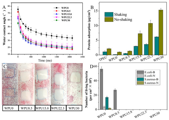 Protein adsorption: The protein adsorption of these WPUn films was tested by bull serum albumin (BSA, dissolved in the isotonic PBS, pH = 7.4). TPEU (0.5 mm thickness) was selected as a control. WPUn and TPEU films were equilibrated in PBS overnight, and then incubated in BSA solution (1 mg·mL−1) at 37 °C for 2 h, and gently rinsed with sterile PBS and deionized water. The adsorbing protein in these samples was eluted in the SDS solution and quantified by a BCA protein assay reagent kit at 562 nm [43]. Independent tests were performed in triplicate samples.