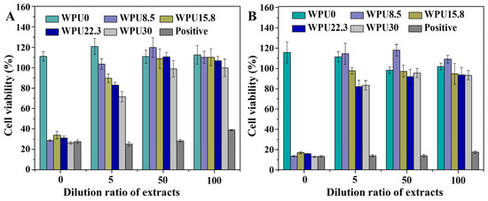 Cytotoxicity of WPUn film extracts and degradation products were performed by Methylthiazoletetrazolium (MTT) assay with a similar process to our previous work [32]. Latex rubber film (Microflex Corp., Sparks, NV) was selected as positive control. Degradation media (NaOH + HCl) were also tested as a blank control. The cell viability was obtained by the following equation.