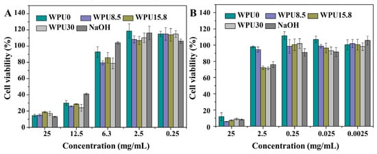 Figure 8. Cell viability of WPUn degradation products with different concentrations after 24 h (A) and 72 h (B) incubation. Error bars represent means ± standard deviation for n = 3. Statistical significance: p < 0.05.