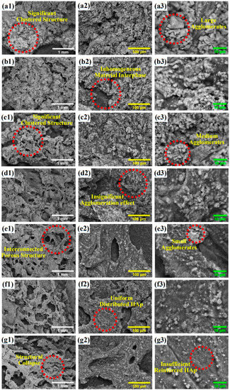Morphological features of synthesized porous composites: ST30 (a1–a3), ST40 (b1–b3), ST50 (c1–c3), ST60 (d1–d3), ST70 (e1–e3), ST80 (f1–f3), and ST90 (g1–g3).